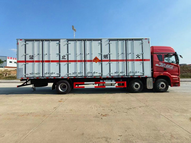 解放氧化性物品運輸車上裝配置:廂體長寬高:9600X2450X2000(MM),荷載噸位:19噸,車輛外部采用專用冷軋鋼板,內(nèi)部采用鋁板,夾層復(fù)合阻燃材料,嚴格控制防火阻燃性,車廂內(nèi)以及邊部安裝的有煙霧報警器以及固定裝置,廂體貼‘易燃液體’危險品標識。